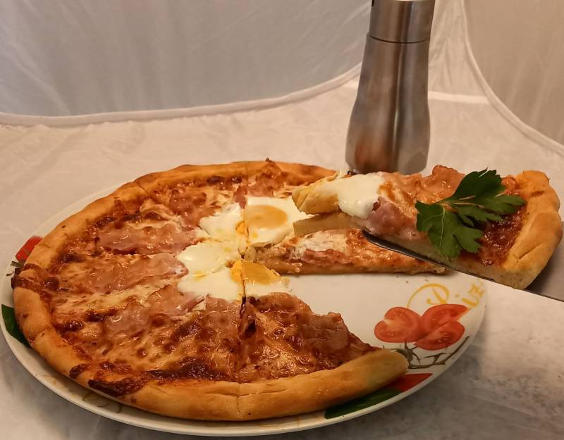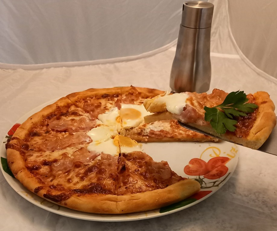 123 Mozzarella sajt, Bacon szalonna, pepperóni paprika, szalámi paprikás, tükör tojás