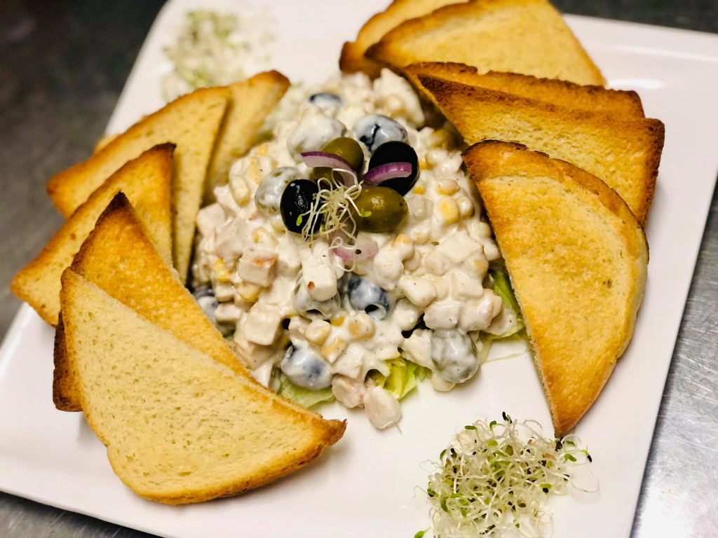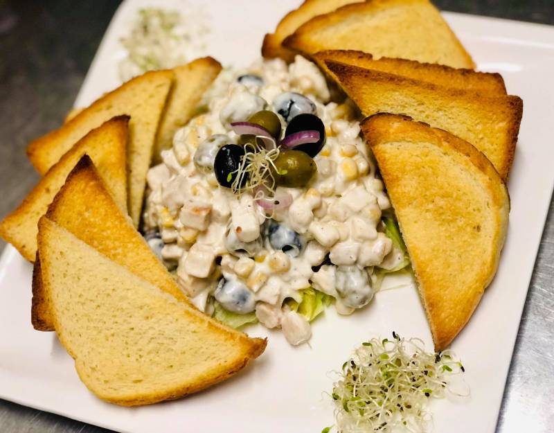 csirkemell roston, jégsaláta levél, kukorica, Majonéz, olívabogyó szeletelt