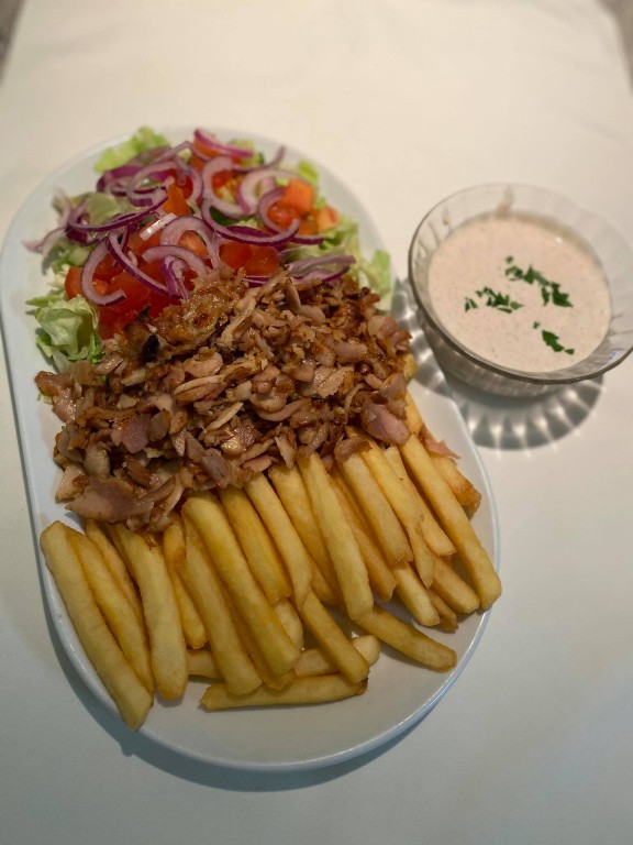 Sültburgonya, csirkemell roston, GYROS ÖNTET, jégsaláta levél, lilahagyma, paradicsom nyersen, Pizzatészta alap, Salátalevél, uborka